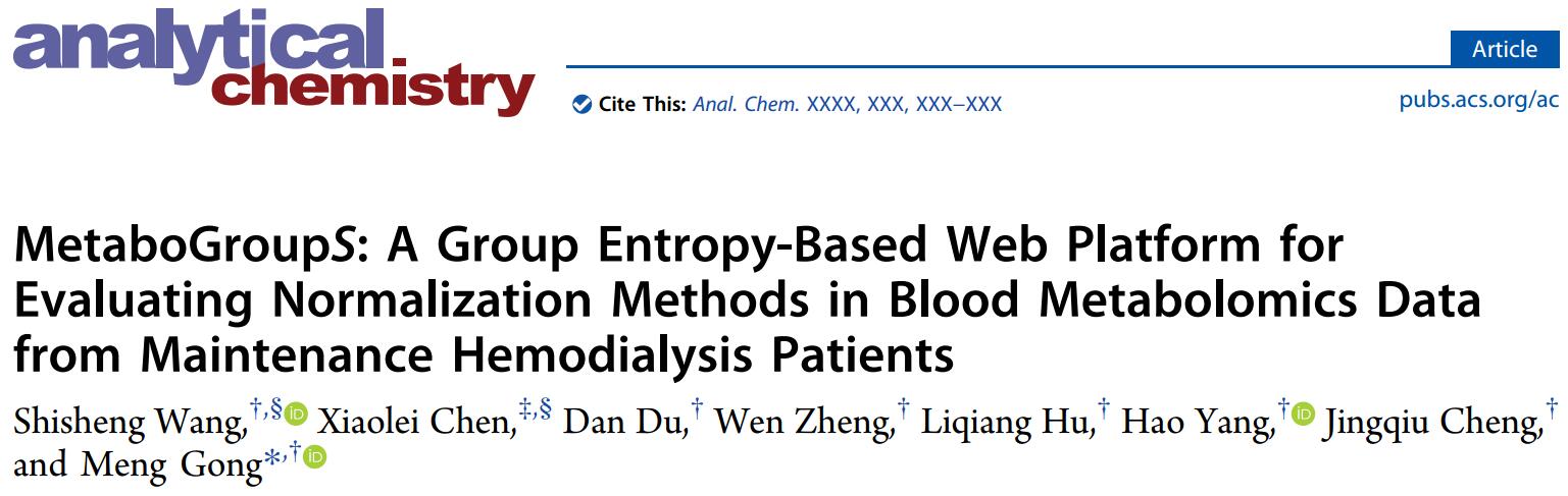 Shisheng Wang, Xiaolei Chen, Dan Du, Wen Zheng, Liqiang Hu, Hao Yang, Jingqiu Cheng, and Meng Gong. "MetaboGroupS: A Group Entropy-based Web Platform for Evaluating Normalization Methods in Blood Metabolomics Data from Maintenance Hemodialysis Patients." Analytical chemistry (2018).DOI: 10.1021/acs.analchem.8b03065