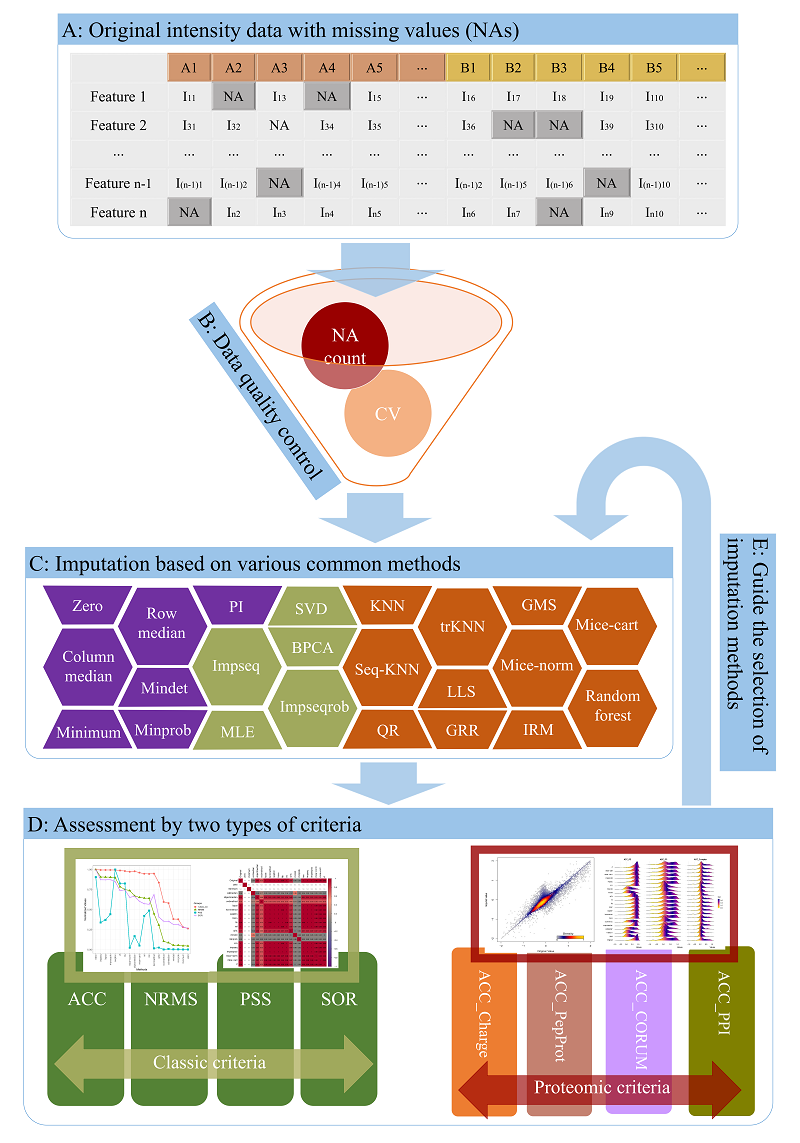 As described above, there are four main steps in the data analysis process of NAguideR: (1) Upload of proteomics data; (2) Data quality control; (3) Missing value imputation; (4) Performance evaluation. However, many users care about the detailed operation in each step. The figure below shows the major steps of the data analysis process in NAguideR. We take two groups of samples (five biological replicates in each group, labeled A1, A2, A3, A4, A5, B1, B2, B3, B4, B5 in the original intensity data) for example. Feature means the identified proteins/peptides.