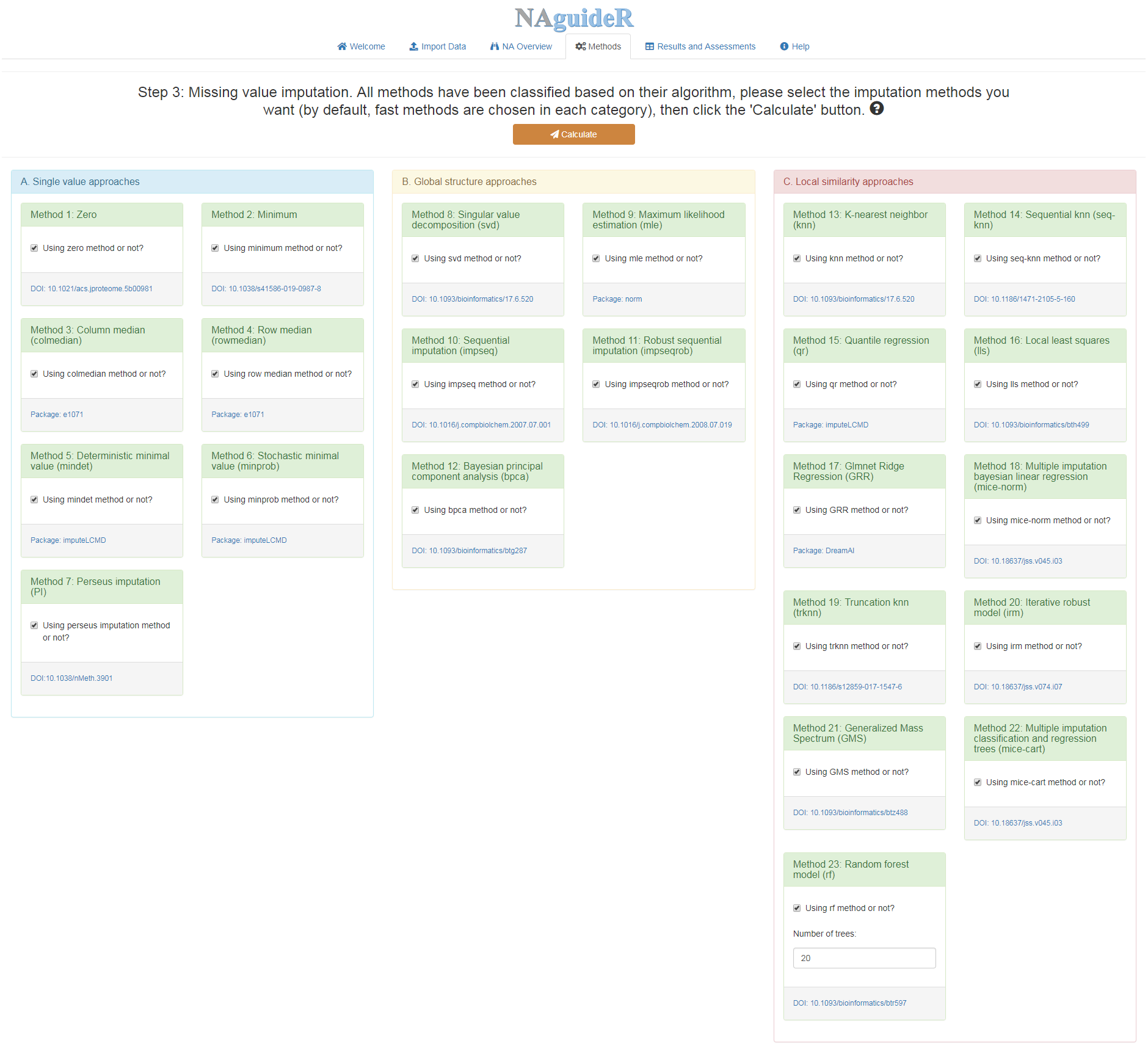 Step 3: Missing value imputation. All methods have been classified based on their algorithm, please select the imputation methods you want (by default, fast methods are chosen in each category), then click the 'Calculate' button.