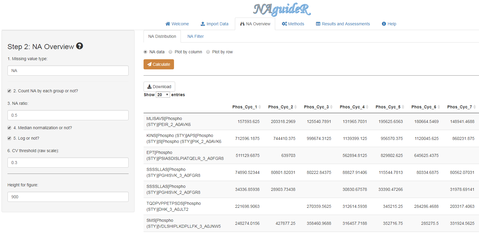 After uploading the right data, users can click 'NA Overview'. In this part, users can check the NA distribution in their data ('NA distribution' part) and those proteins/peptides with excessively high proportion of NA and large coefficient of variation (CV) will be removed ('Filter' part). After setting suitable parameters, just click the 'Calculate' button.