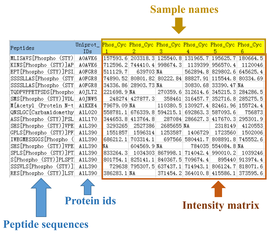 Under this circumstance, peptide sequences, and protein ids are sequentially provided in the first two columns of input file. Peptide sequences in the first column can be peptides with post-translational modification (PTM) or stripped peptides (without PTM). The protein ids in the second column should be UniProt ids. From the third column, peptides/proteins expression intensity or signal abundance in every sample should be listed. The data structure is shown as below: